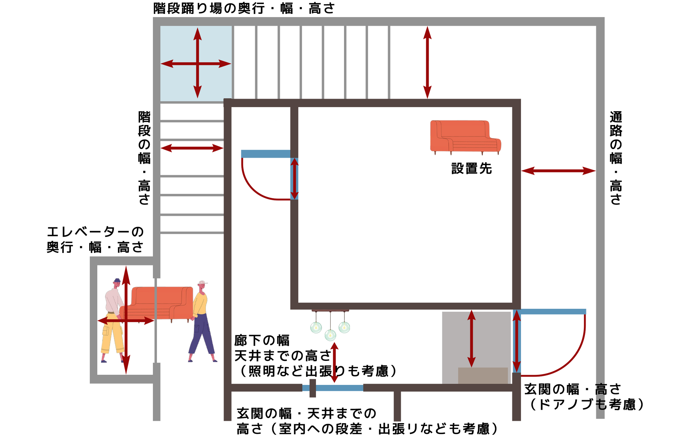 お部屋への商品搬入経路について、通路幅や天井の高さなどを考慮し、正確な情報をもとにシミュレーションを行うことが大切です。予想外の障害物や意外なスムーズさもあるため、下記の図を参考に箇所ごとにサイズを測定し、建物やお部屋の構造に合わせて確認を行ってください。