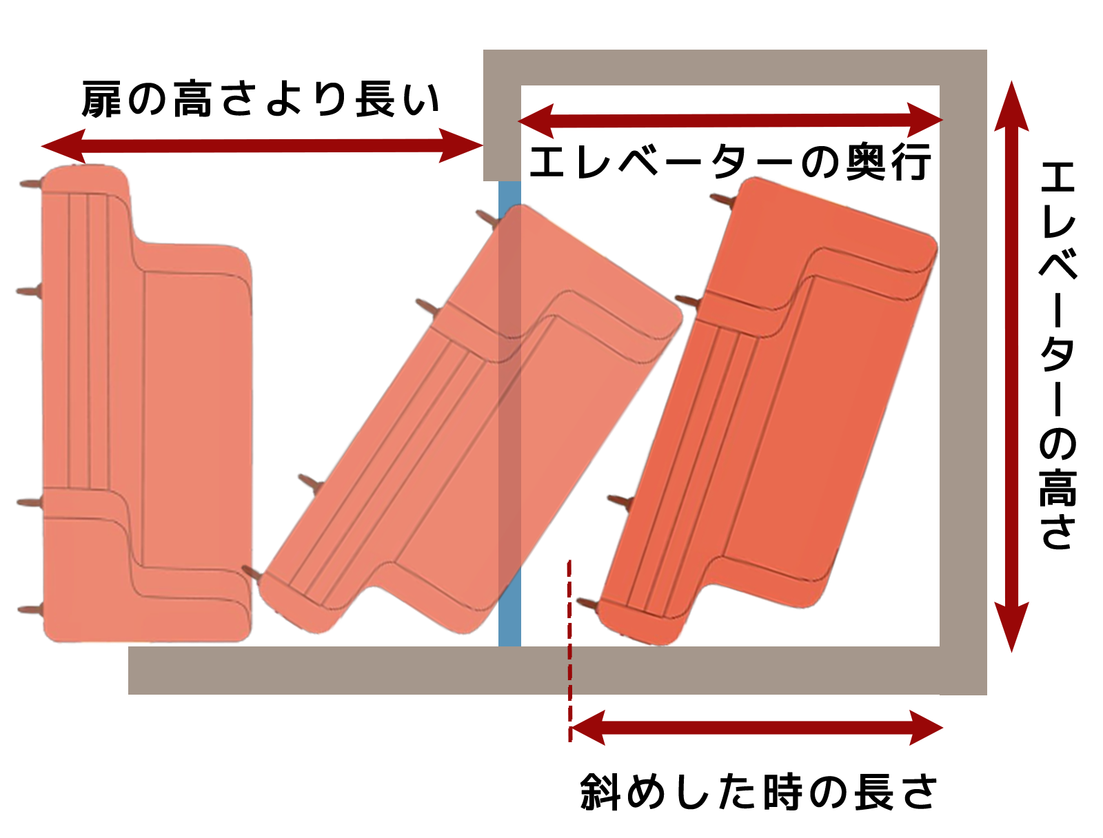 もし天井が商品の一番長いサイズよりも低い場合、商品を水平に保ちながら搬入する必要があります。商品の傾けた状態では通らない場合でも、水平に運ぶことでスムーズな搬入が可能となります。 - 曲り角への対応