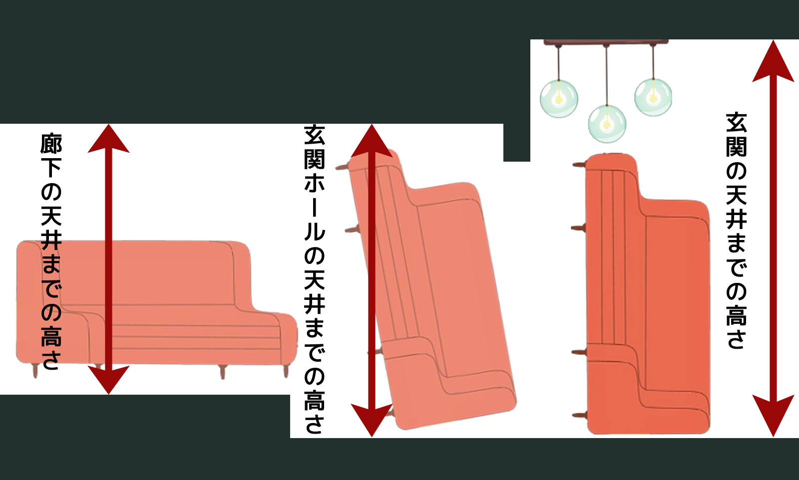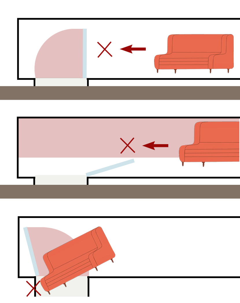 ✔ 搬入経路の幅は、運びたい家具の横幅・奥行・高さのうち、最も短いサイズ以上でないと通ることができません。